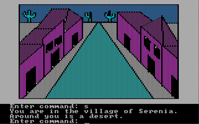 Like the apple II and Atari versions, the game uses dithering to give the illusion of more colors or shades. However, the game tends to max out about six or seven 'colors' or 'shades' on any given screen. Thus it appears to have even less colors than the apple II version. The primary color scheme is even more drab than the secondary one (using more gray and blacks). On the one hand, the cacti and the desert scenes in general using the second mode look more colorful than in the Apple II version (which used a rather drab 'grey' made from dithering white and black for both sand and plant life), as the cacti actually look 'green'.
