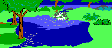 The name Beautiful Lake originates from the maps in the KQ1 Hintbook by Al Lowe. It is described as the "beautiful little lake" in KQ1. The second half of the lake is described as the Small Waterfall in Lake, in the KQ2 hintbook.