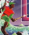 On the KQ2 box, he wore green pants, a red tunic (with gold lining), with a green shirt underneath, and a green adventurer's cap with a red feather. He shown holding golden magic sword in his leather gloved hands. The KQ1 SMS box also has some interesting differences in that he has a cape, and his red shirt is long sleeved, and he is missing his traditional hat. He also has a sword which is not common for the character.