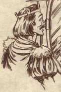To keep warm, he two pairs of woolen pants, and three pairs of cotton shirts. He put on several pairs of socks, and a well-worn leather boots. Over the shirts wore another tunic which had a pocket where he is able to keep things, and has a button to close it. He put on a wool jerkin that was coarse, un-dyed, and most importantly thick. He cinched it around his waist with a leather belt, and belt knife in a sheaf attached to his belt. Then he put on a scarf, black wool mittens and a fur hat. He wore a wool outer cloak, dyed black with the royal sigil of Daventry (gyrfalcon embroidered in white and gold) on the back. The cloak had an inner pocket (where he kept a tinderbox).[7] He also had a gold band inlaid with pearls had been a gift from Valanice.