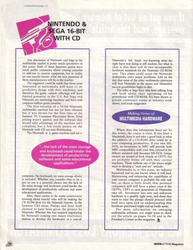 - ↑ InterAction_Magazine_Vol._V_Number_1_Spring_1992 Any discussion of Nintendo and Sega in the multimedia market is pretty much speculative at this point. Both of these Japanese giants have made public comments about coming consoles or add-ons to current equipment, but in reality no one exactly knows what the true potential of these manufacturers will be in the market.