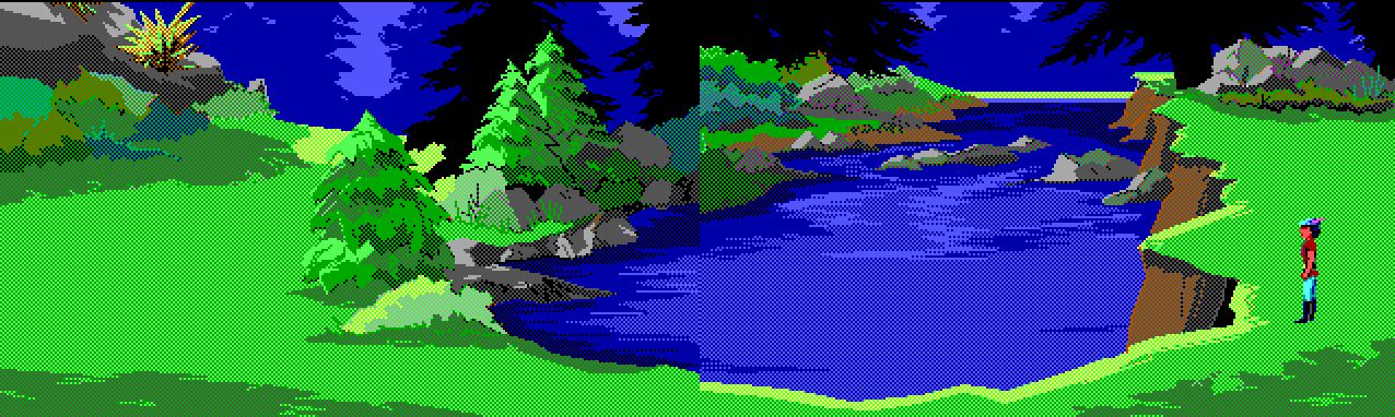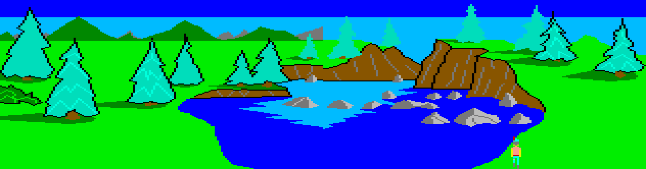 The 'clear mountain lake/picturesque mountain lake' appears by extension in the fan remake, King's Quest I: Quest for the Crown VGA, see clear mountain lake (unofficial).