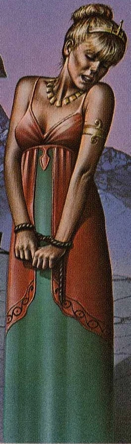 Once the fair princess of Serenia, she was was kidnapped by Harlin the Malevolent. Harlin had turned her into a frog. She was rescued by a legendary individual, a barbarian, remembered only as "The Wanderer" was sent to her homeland from the distant future by Harlin, given the chance to rescue her. Priscilla was able to appear as a vision far more fair, than the wizard had been to the hero. She explained that what the wizard had warned was true; his magic was powerful and the obstacles great, but that the journey was far from impossible. She offered him a computer and a few words of encouragement and advice. Finally she explained to him that he was 'the wanderer' of legend fated to save her, and that he would have to go on the journey on his own.