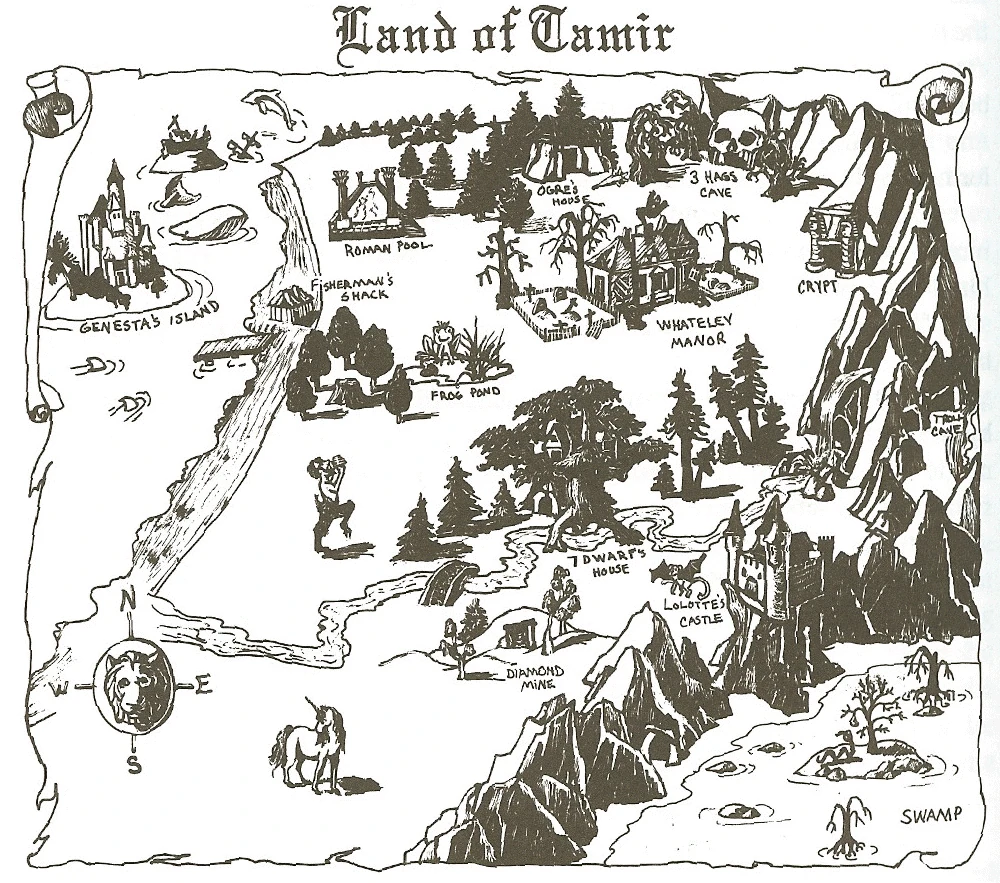 - Enigmatic references to the Town of Tamir are made in some of the promotional materials in the Sierra catalogs, and inside other games such as Police Quest 2. Other than it claiming she visited the town, no specific town (or at least no dense layout people generally think of as a town) appears in the game. Apparently the map itself with its houses (fisherman’s shack, ogre cottage, dwarf’s house,, Whately Manor, Witch’s Cave), as well as a population of citizen Ents, make up the neighborhood.[10] While the Roman Pool makes up a nice park. Perhaps Lolottes’s also shares the same zip code (though she has most isolated private property on the mainland). Genesta owns her own private island retreat as well (it’s unclear if that is considered laws of the town zip code as well).