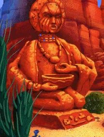 The statue of the Water God holding a bowl stands in front of a well full of salt water. A few salt crystals sit next to the well. At the base of the statue are instructions that show how to purify the water. The statue's face can be manipulated to turn the statue into a sun god.[2]