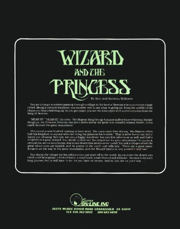 - ↑ From the back of the box; " WIZARD AND THE PRINCESS (tm) COM 64 DISKETTE VERSION BY BOBBIT SRL 812 WARNING: This is MORE than an Arcade style endeavor. Enter the world of computer adventure. Each Sierra On-Line adventure takes several weeks to master, providing hours of fascination and intrigue. The player must use their imagination and logic to unlock the mysteries of each adventure. Map skills are a must since our adventure games contain over a hundred full-color computer-generated images which lead you in every direction. So, muster up all your wit, logic and perseverance for this is a Sierra On-Line adventure and a challenge to your ingenuity. Become the hearty and steadfast adventurer who rescues the fair princess from the dreadful wizard, Harlin. He has taken her to his towering castle beyond the Great Mountains. You must outwit and outmaneuver the mystical power of the wizard which has grown dark and potent through time. Begin your adventure in the small village of Serenia, but take heed, everything is not as it may appear... "Sets a standard by which future graphic adventures will be judged." - The Book of 1983 Software"